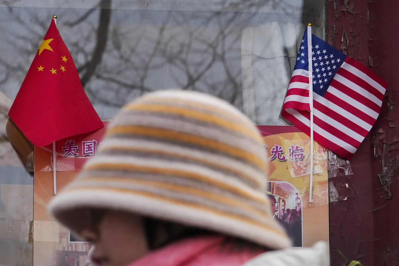 A woman walks by the Chinese and U.S. national flags on display outside a souvenir shop in Beijing on Jan. 31, 2025.Andy Wong/AP